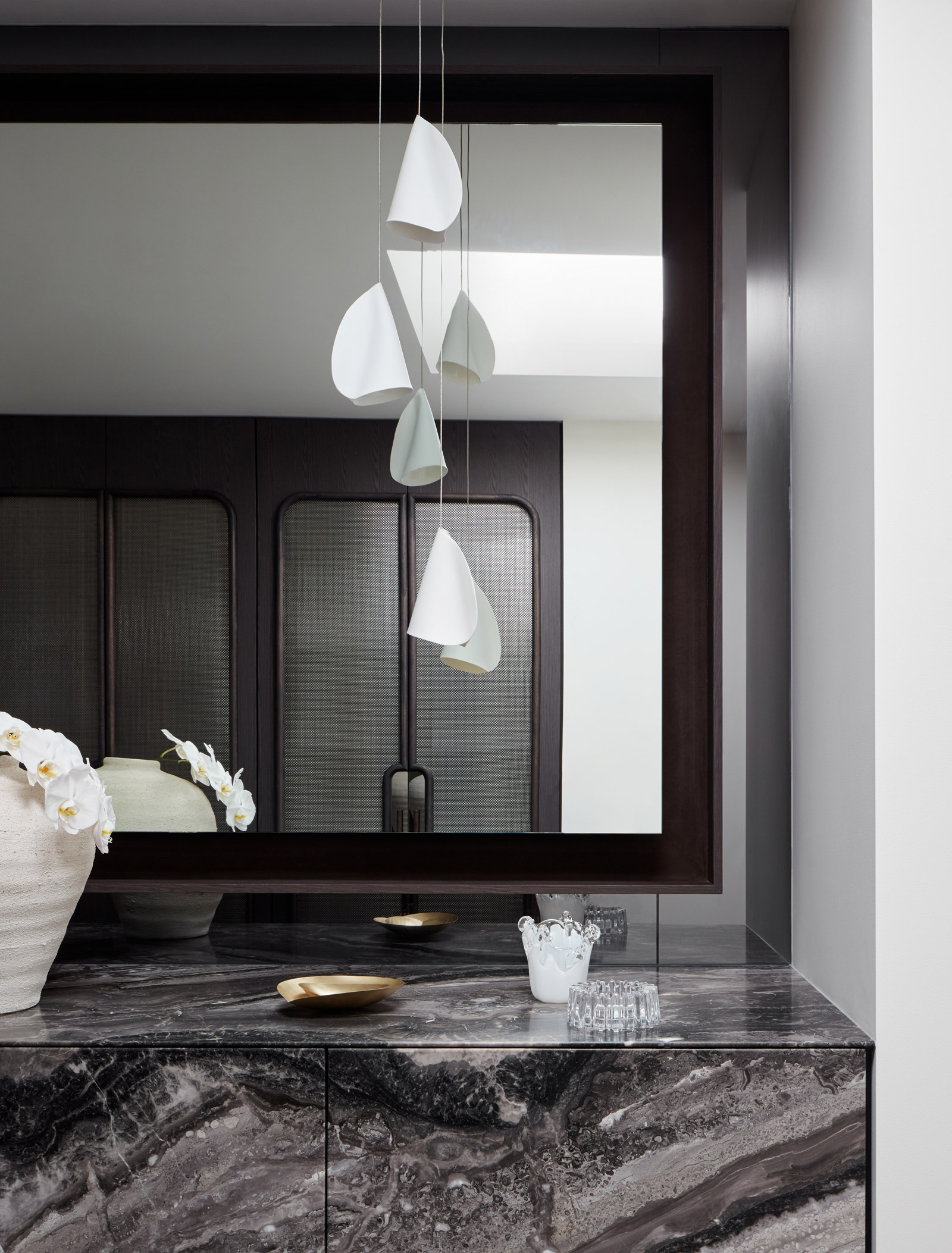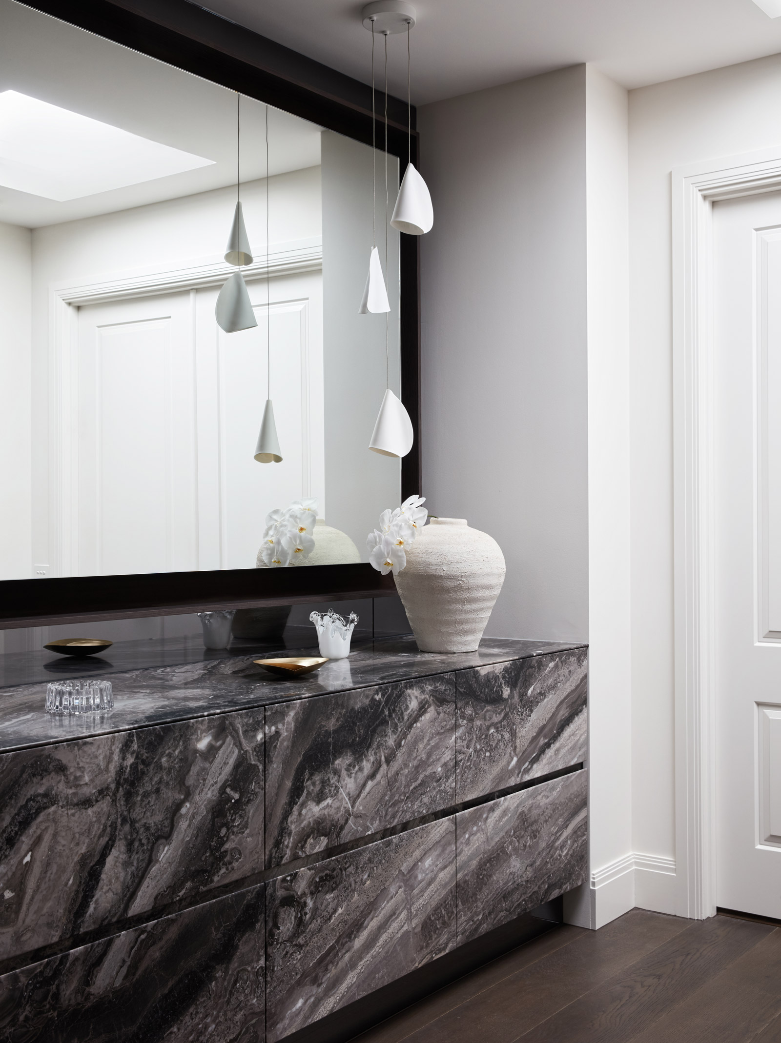High-end joinery and stone enhance the entrance to the master retreat, imparting luxury and emphasizing its inherent grandeur.