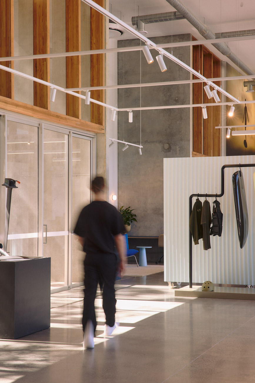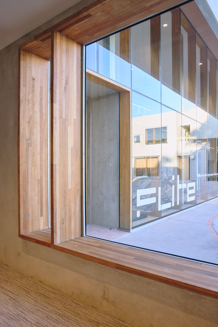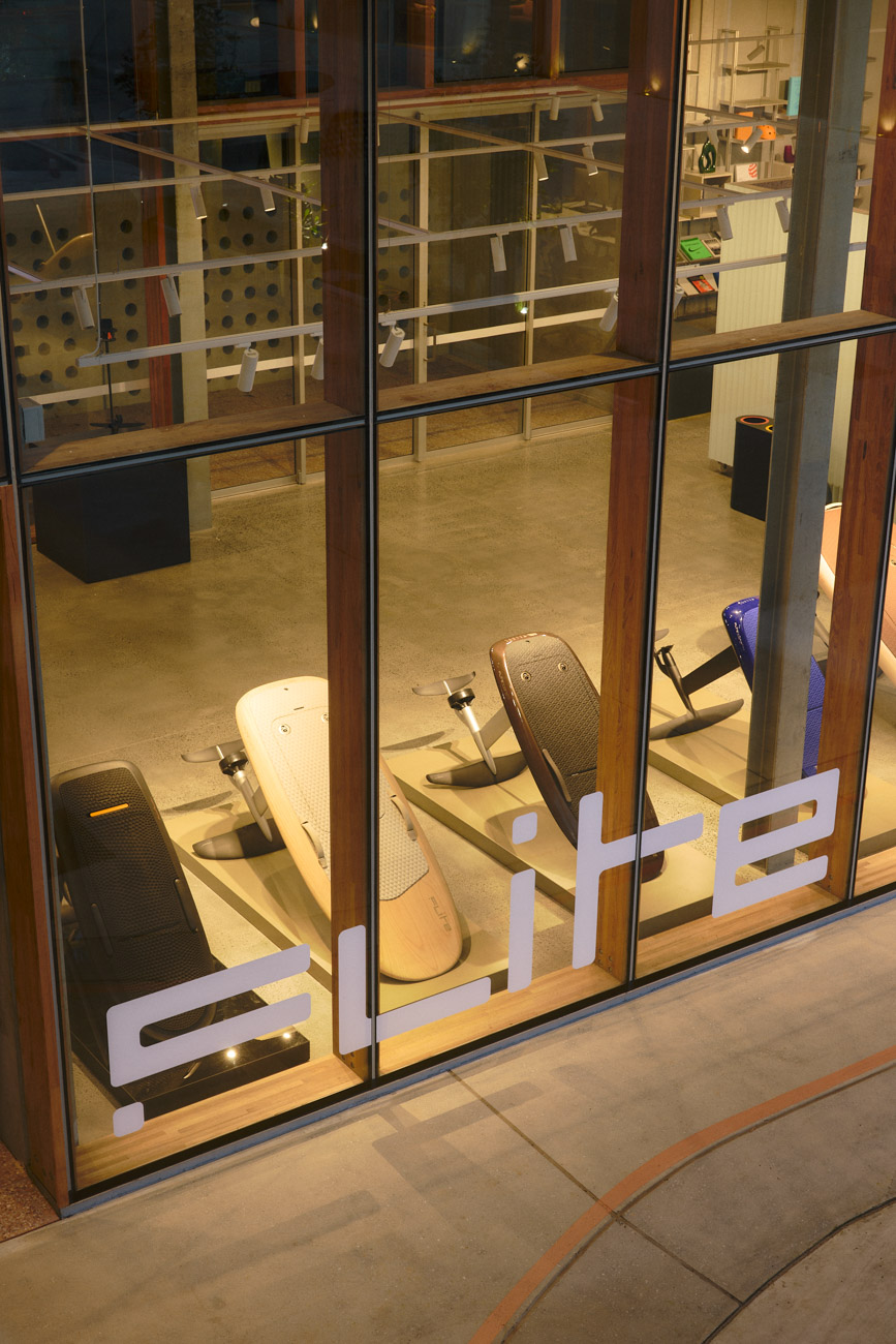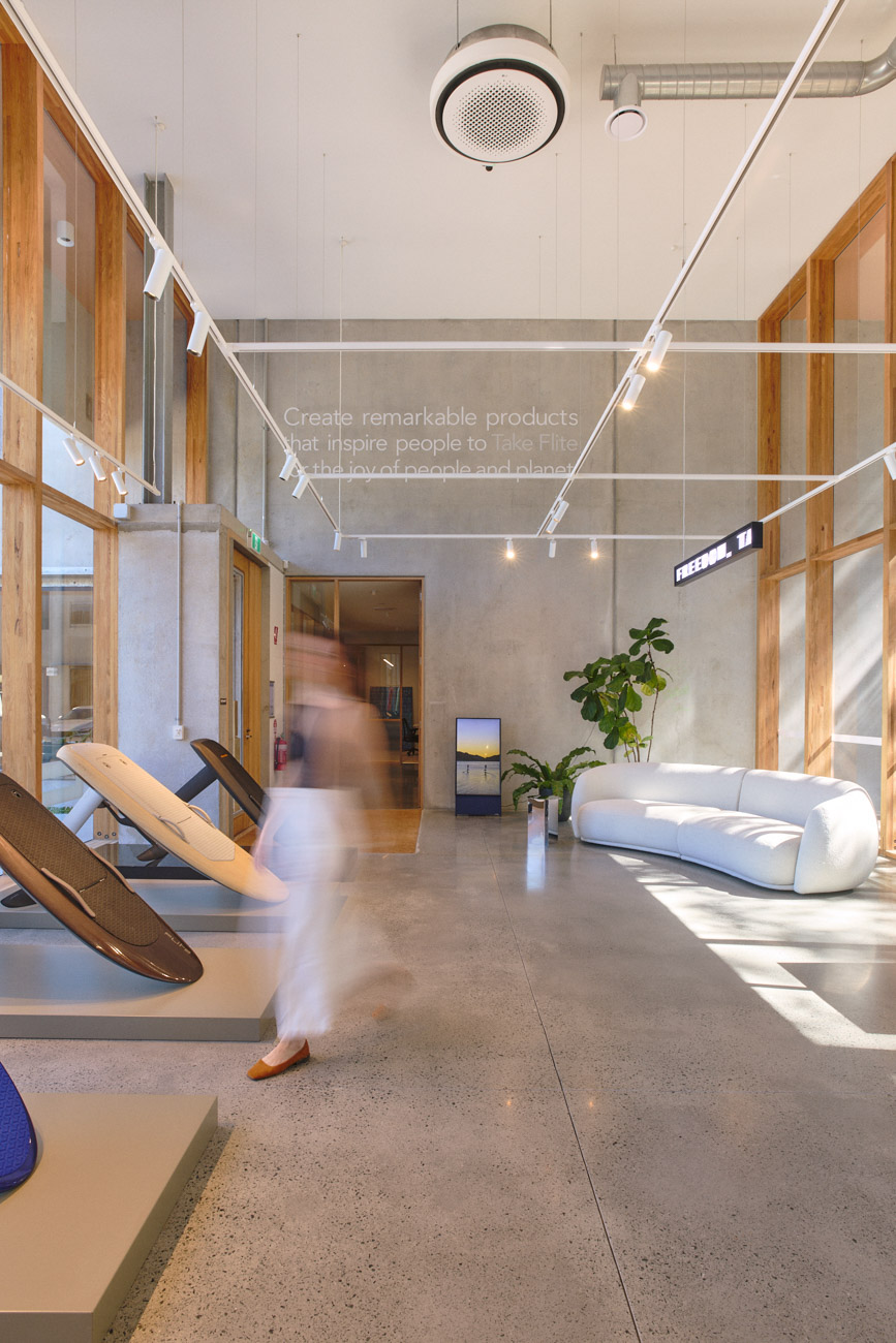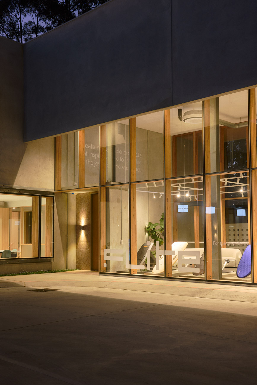 The internal fitout of Fliteboard’s spiritual HQ in the industrial estate of Byron Bay.
